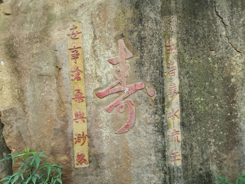 步道中有一處刻著紅色大「壽」字樣的山壁,對聯一闕「浮生若夢水流年,世事滄桑興渺然。」以這塊岩壁來說,木山層地層形成年代在2200萬-2400萬年前的中新世,與百年人生相較,確是高壽許多。以這闕對聯來說,若能將七字聯調整為四字聯,留下前四字就更清楚明晰了,浮生若夢、世事滄桑,確是中年感嘆;又如果刻文是蘇軾西江月的「休言萬事轉頭空,未轉頭時皆夢。」那就更添感慨了!